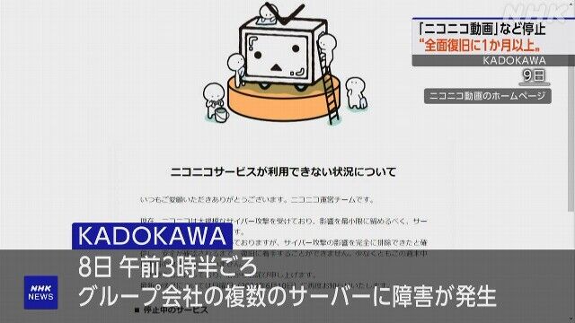 | ニコニコ、復旧には1カ月以上を要すると発表 動画や生放送データは無事を報告 …KADOKAWAグループへの大規模なサイバー攻撃の影響で、6月8日早朝からサービスを停止しているニコニコ(ニコニコ動画やニコニコ生放送等の総称)の運営が… (出典:KAI-YOU.net) |